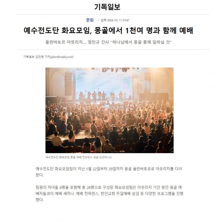 뮤직타임 [기사_인터뷰] 예수전도단 화요모임, 몽골에서 1천여 명과 함께 예배(기독일보)