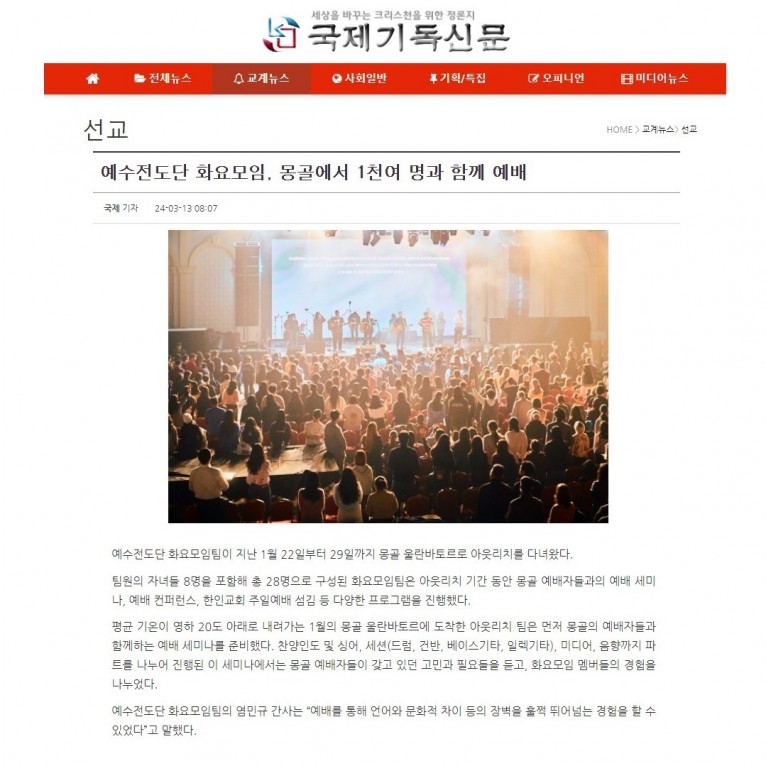 뮤직타임 [기사_인터뷰] 예수전도단 화요모임, 몽골에서 1천여 명과 함께 예배(국제기독신문)