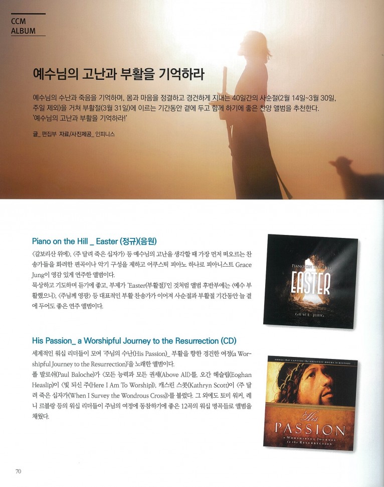 묵상하고 기도하며 듣기에 좋고, 부제가 ‘Easter(부활절)’인 것처럼 앨범 후반부에는 ‘예수 부활했으니’, ‘주님께 영광’ 등 대표적인 부활 찬송가가 이어져 사순절과 부활절 기간동안 늘 곁에 두어도 좋은 연주 앨범.