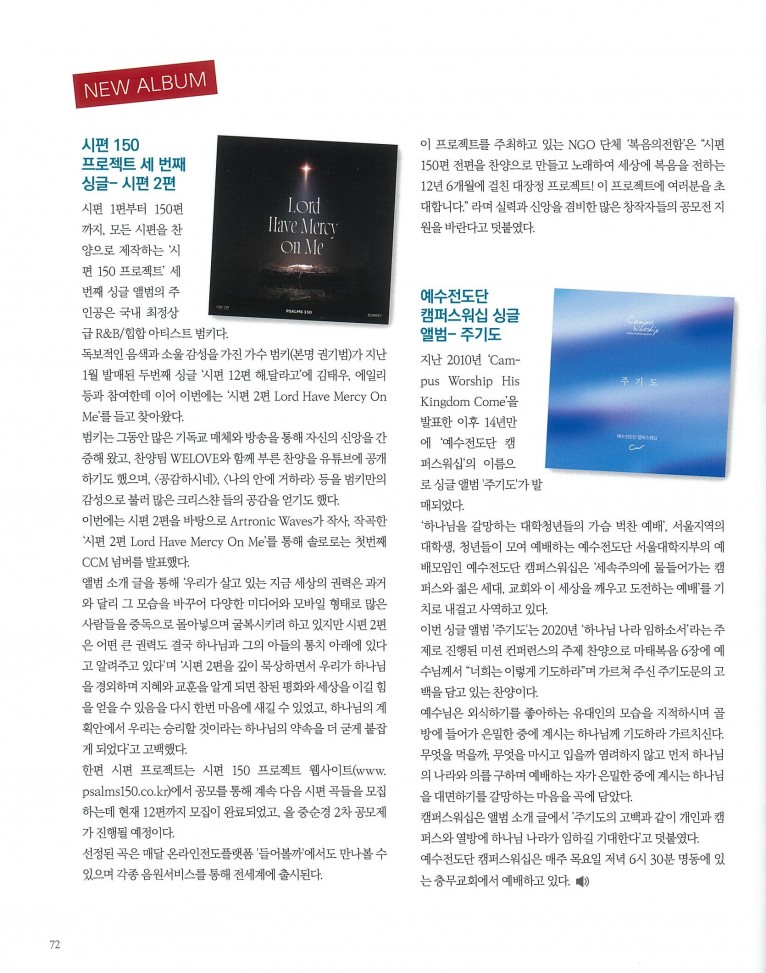 뮤직타임 [잡지] New Album_ 시편 150 프로젝트 Vol. 2 - 범키, 예수전도단 캠퍼스워십 - 주기도(월간 Church M…