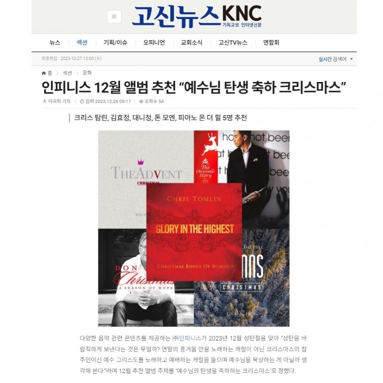 다양한 음악 관련 콘텐츠를 제공하는 ㈜인피니스가 2023년 12월 성탄절을 맞아 “성탄을 바람직하게 보낸다는 것은 무얼까? 연말의 흥겨움 만을 노래하는 캐럴이 아닌 크리스마스의 참 주인이신 예수 그리스도를 노래하고 예배하는 캐럴을 들으며 예수님을 묵상하는 게 아닐까 생각해 본다.”라며 12월 추천 앨범 주제를 ‘예수님의 탄생을 축하하는 크리스마스’로 정했다.