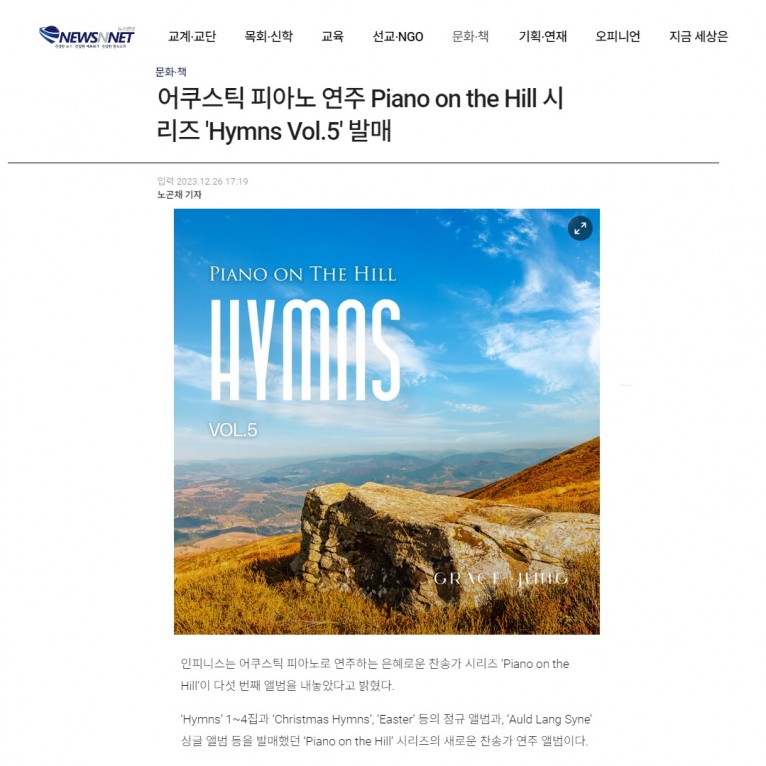 [기사] 어쿠스틱 피아노 연주 Piano on the Hill 시리즈 'Hymns Vol.5' 발매(뉴스앤넷)
