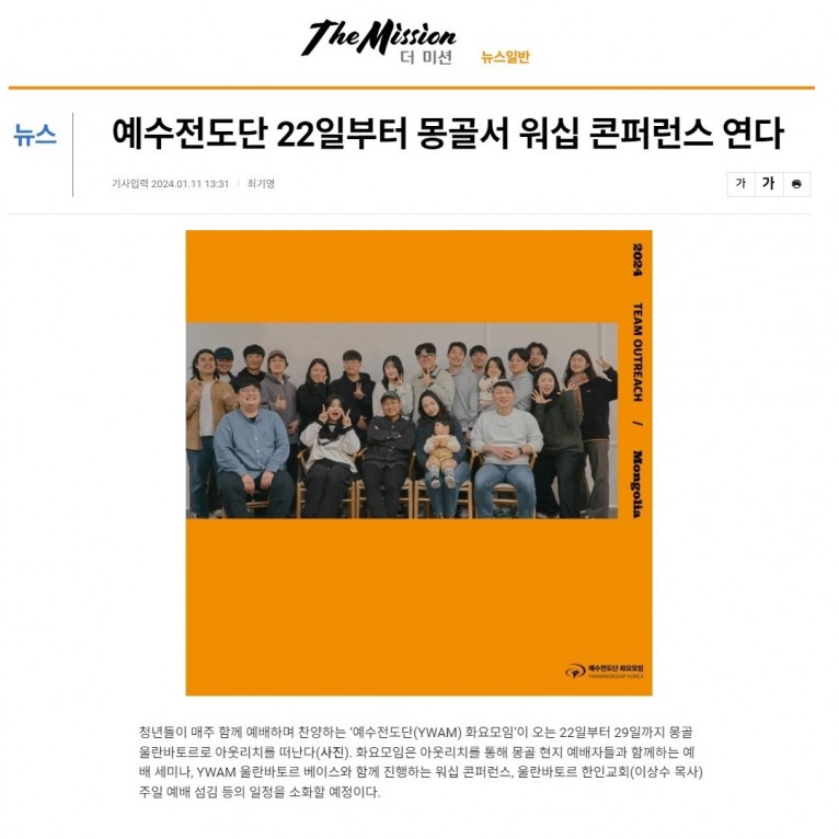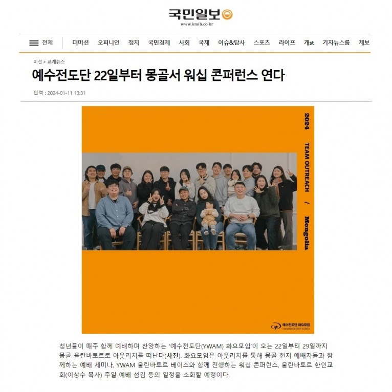 [기사] 예수전도단 22일부터 몽골서 워십 콘퍼런스 연다(국민일보)