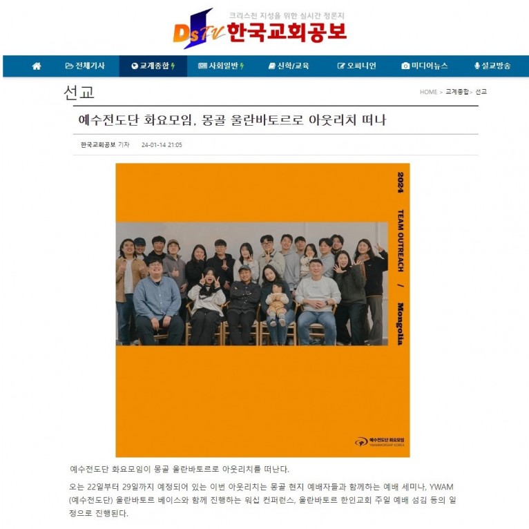 뮤직타임 [기사] 예수전도단 화요모임, 몽골 울란바토르로 아웃리치 떠나(한국교회공보)
