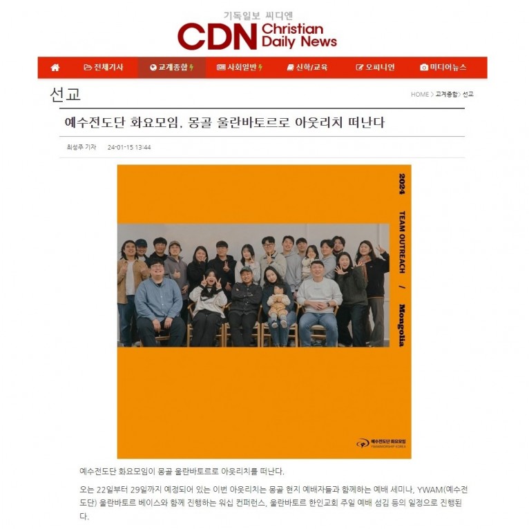 [기사] 예수전도단 화요모임, 몽골 울란바토르로 아웃리치 떠난다(기독일보 씨디엔)