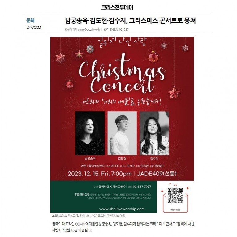 한국의 대표적인 CCM사역자들인 남궁송옥, 김도현, 김수지가 함께하는 크리스마스 콘서트 “길 위에 나신 사랑”이 12월 15일에 열린다.