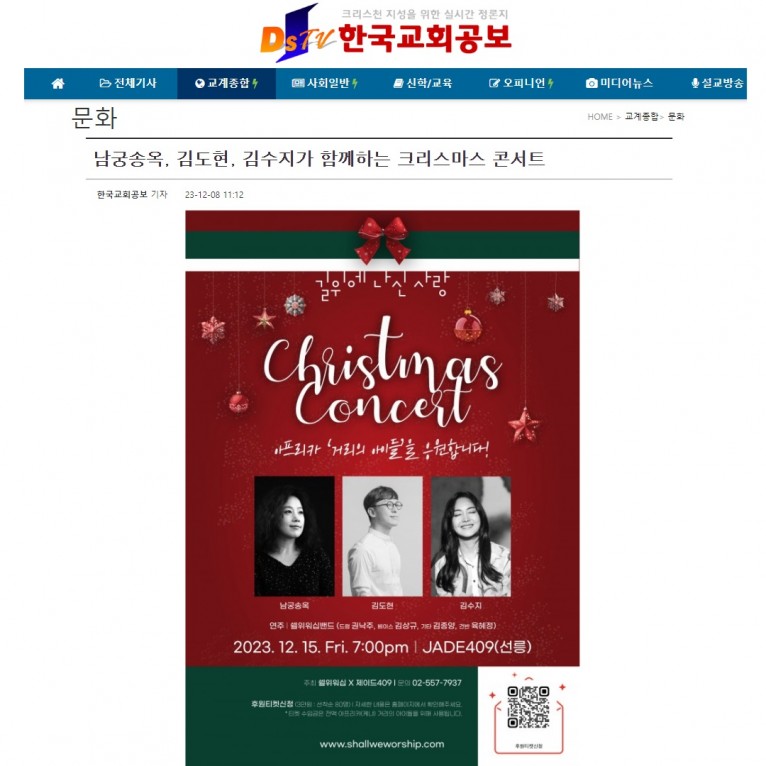 [기사] 남궁송옥, 김도현, 김수지가 함께하는 크리스마스 콘서트(한국교회공보)