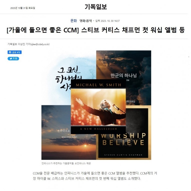 CCM을 전문 배급하는 인피니스가 가을에 들으면 좋은 CCM 앨범을 추천했다. CCM계의 거장 마이클 W. 스미스와 스티븐 커티스 채프먼의 첫 번째 워십 앨범도 소개했다.