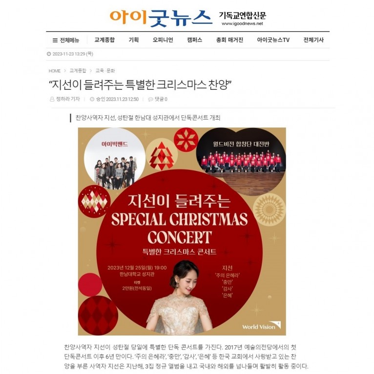 [기사] “지선이 들려주는 특별한 크리스마스 찬양”(아이굿뉴스)