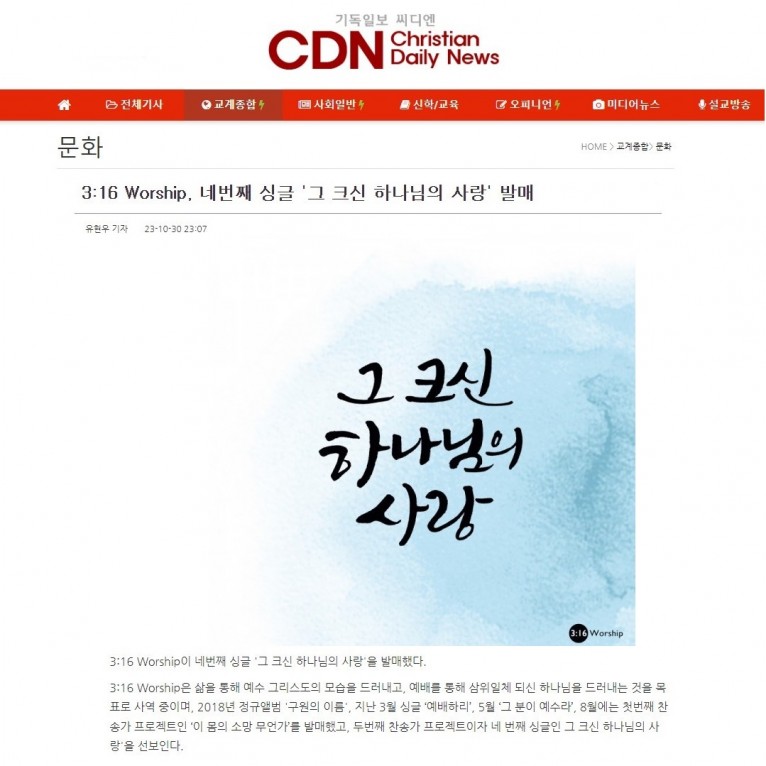 [기사] 3:16 Worship, 네번째 싱글 '그 크신 하나님의 사랑' 발매(기독일보 씨디엔)