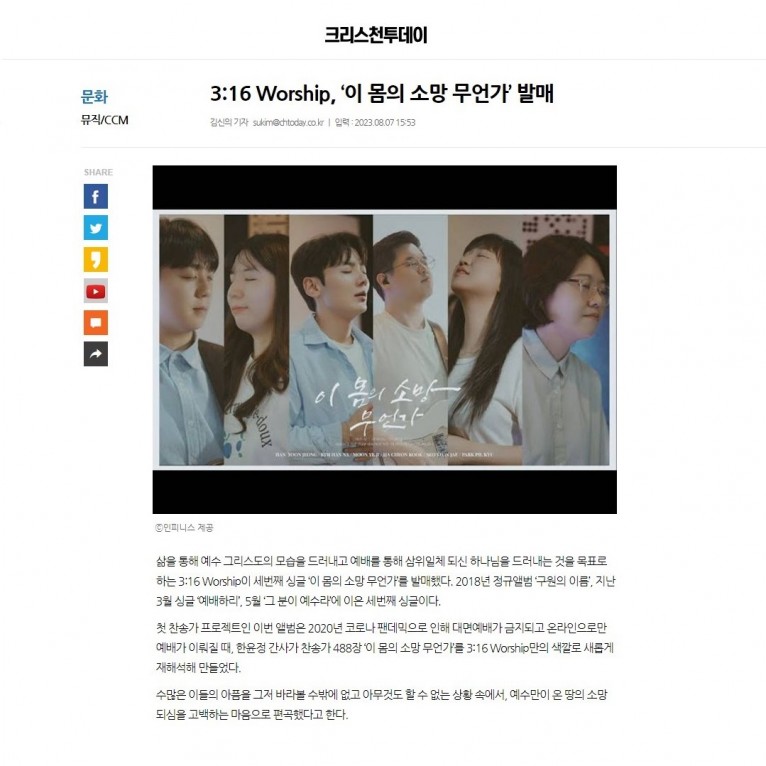 [기사] 3:16 Worship, ‘이 몸의 소망 무언가’ 발매(크리스천투데이)