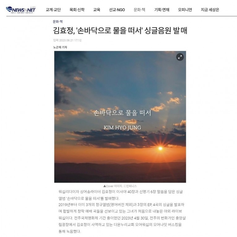 [기사] 김효정, '손바닥으로 물을 떠서' 싱글음원 발매(뉴스앤넷)
