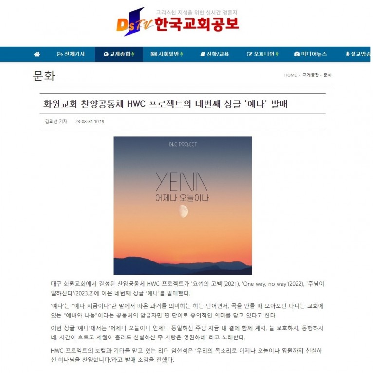 [기사] 화원교회 찬양공동체 HWC 프로젝트의 네번째 싱글 ‘예나' 발매(한국교회공보)