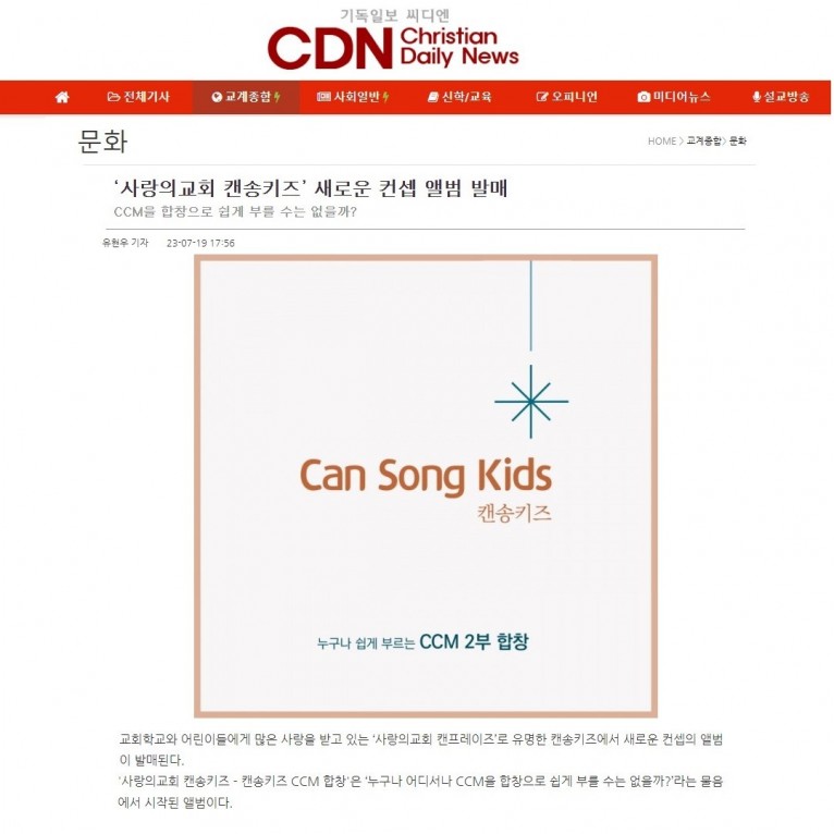 뮤직타임 [기사] ‘사랑의교회 캔송키즈’ 새로운 컨셉 앨범 발매(기독일보 씨디엔)