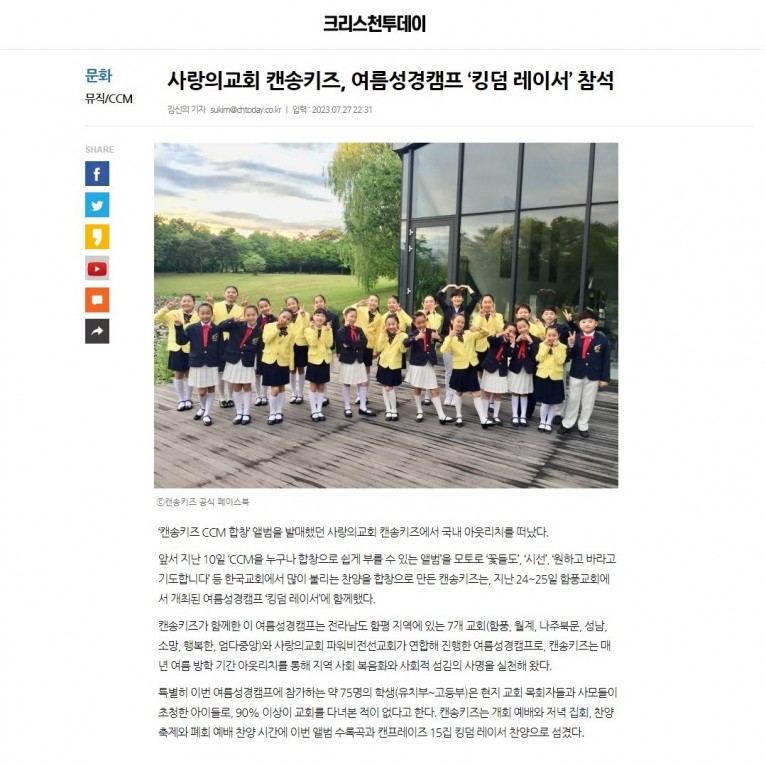 뮤직타임 [기사] 사랑의교회 캔송키즈, 여름성경캠프 ‘킹덤 레이서’ 참석(크리스천투데이)
