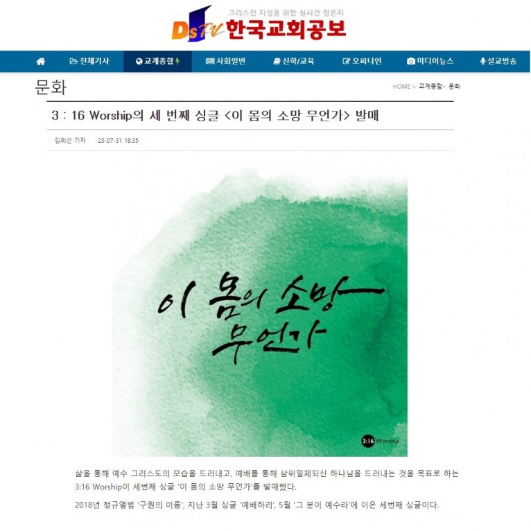 [기사] 3:16 Worship의 세 번째 싱글 <이 몸의 소망 무언가> 발매(한국교회공보)