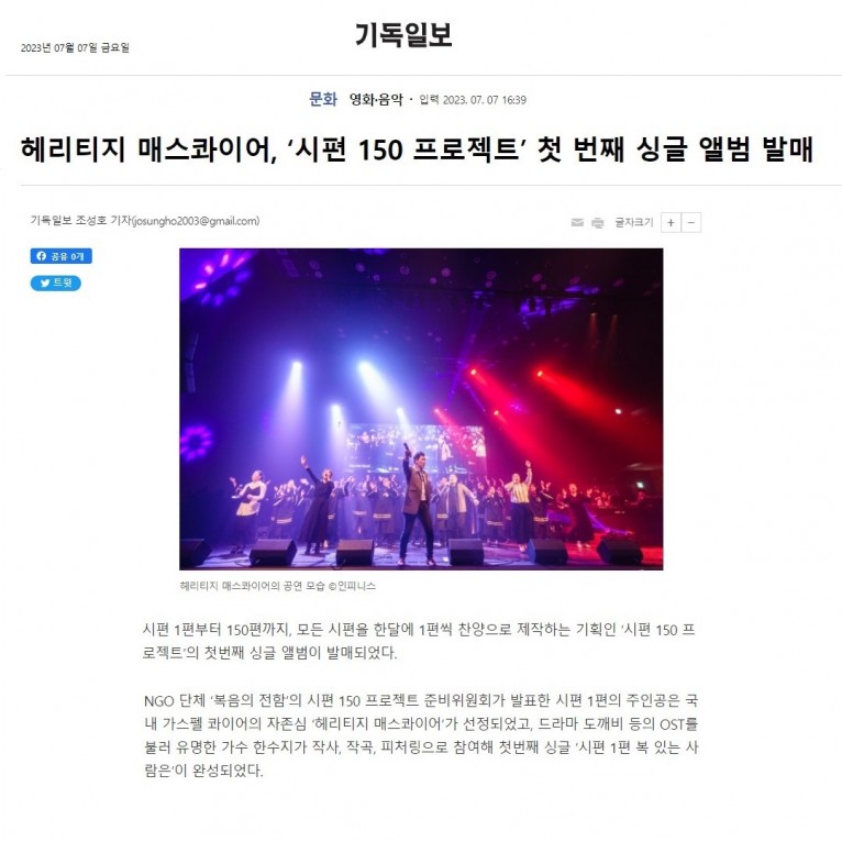 뮤직타임 [기사] 헤리티지 매스콰이어, ‘시편 150 프로젝트’ 첫 번째 싱글 앨범 발매(기독일보)