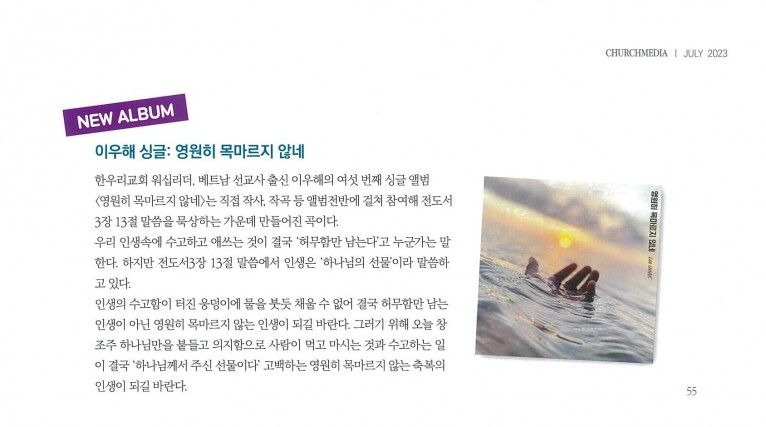 뮤직타임 [잡지] 이우해 싱글: 영원히 목마르지 않네(월간 Church Media 7월호)