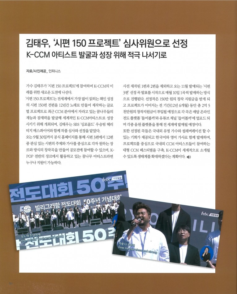 뮤직타임 [잡지] 김태우, ‘시편 150 프로젝트’ 심사위원으로 선정(월간 Church Media 7월호)