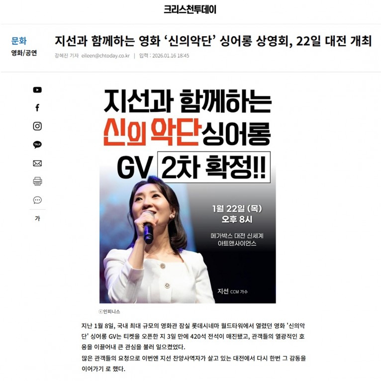 [기사] 지선과 함께하는 영화 ‘신의악단’ 싱어롱 상영회, 22일 대전 개최(크리스천투데이)
