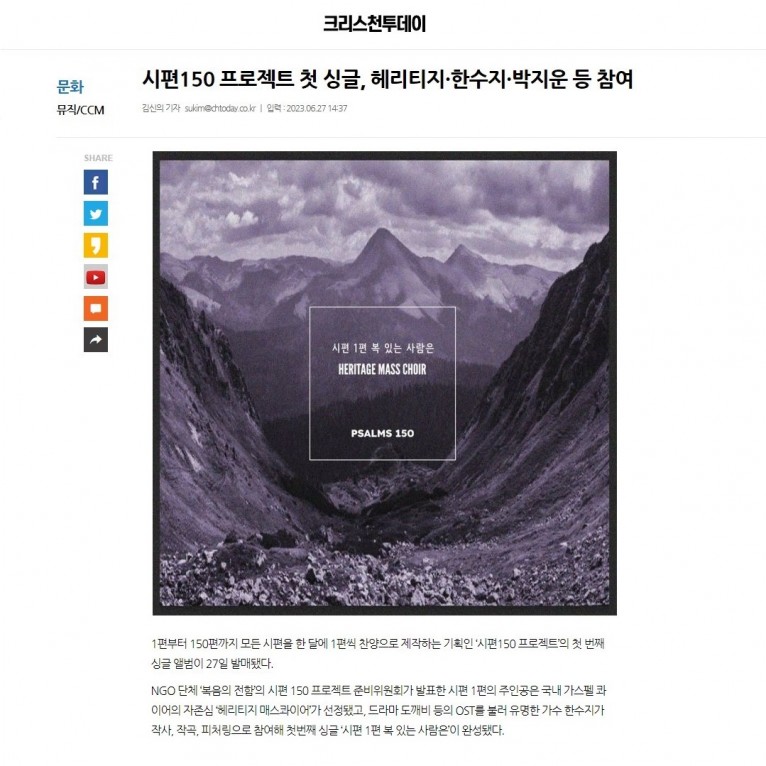 [기사] 시편150 프로젝트 첫 싱글, 헤리티지·한수지·박지운 등 참여(크리스천투데이)