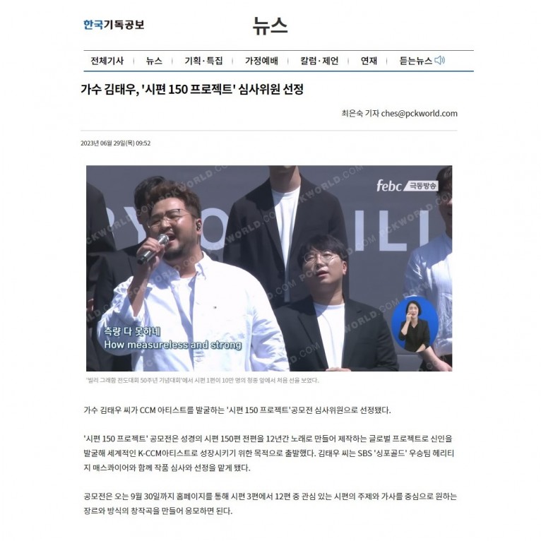 [기사] 가수 김태우, '시편 150 프로젝트' 심사위원 선정(한국기독공보)