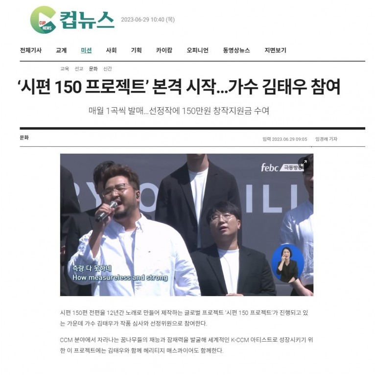 [기사] ‘시편 150 프로젝트’ 본격 시작…가수 김태우 참여(크리스챤연합신문)