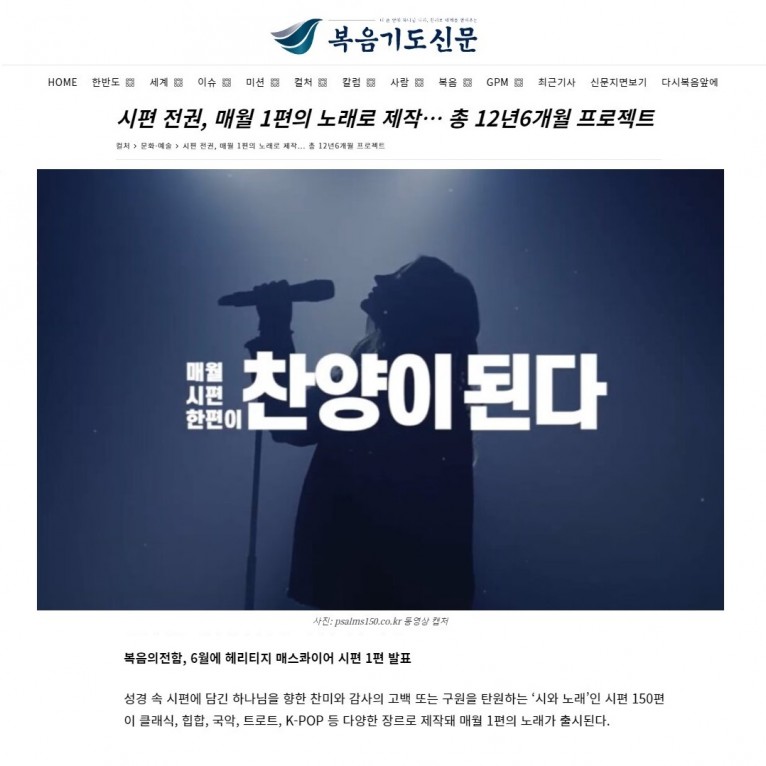 [기사] 시편 전권, 매월 1편의 노래로 제작… 총 12년6개월 프로젝트(복음기도신문)