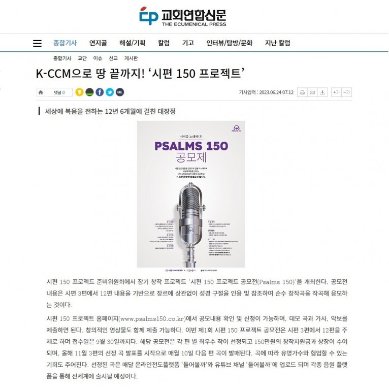 [기사] K-CCM으로 땅 끝까지! ‘시편 150 프로젝트’(교회연합신문)