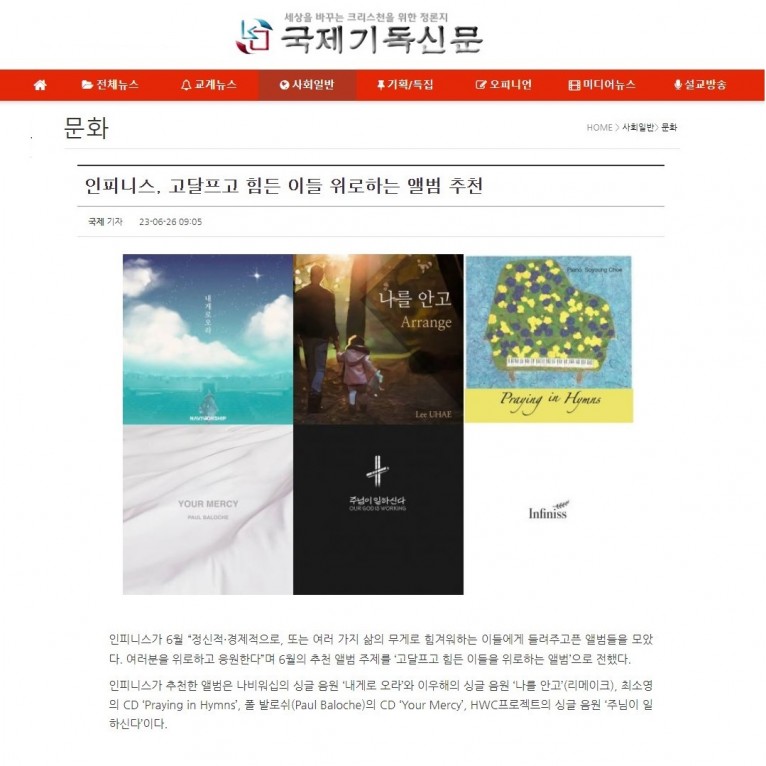 [기사] 인피니스, 고달프고 힘든 이들 위로하는 앨범 추천(국제기독신문)
