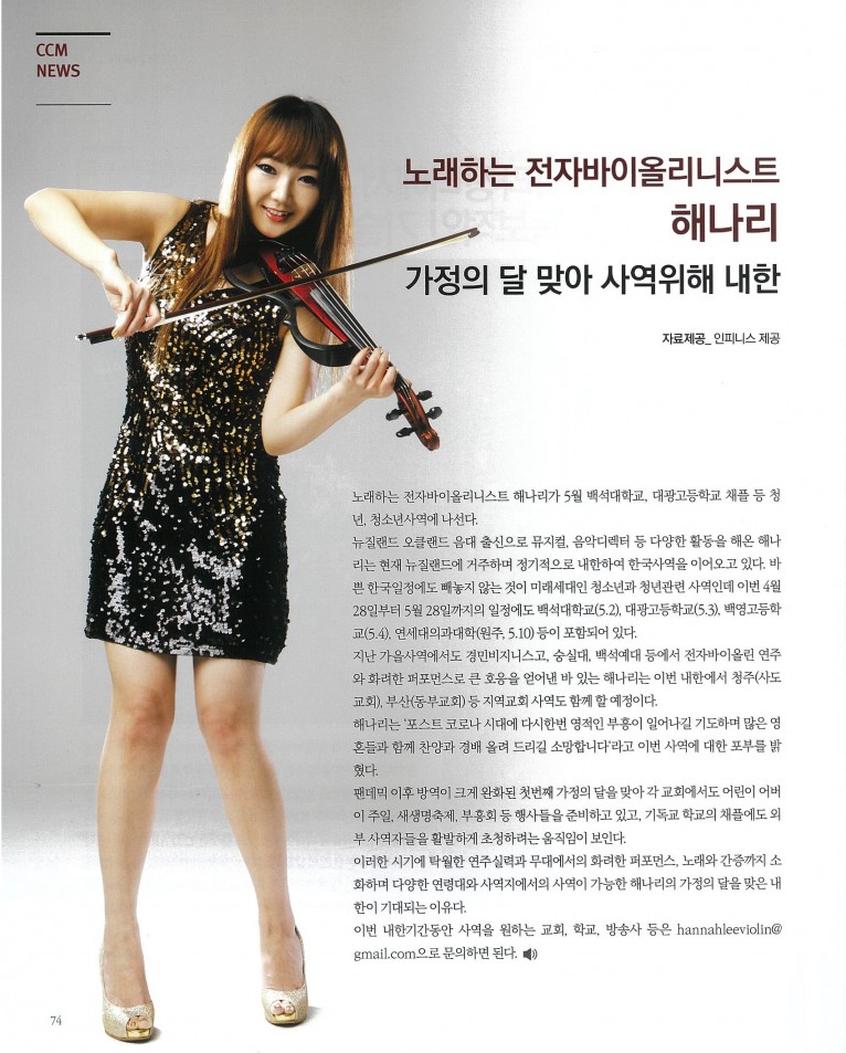 [잡지] 노래하는 전자바이올리니스트 해나리, 가정의 달 맞아 사역위해 내한(월간 Church Media 5월호)