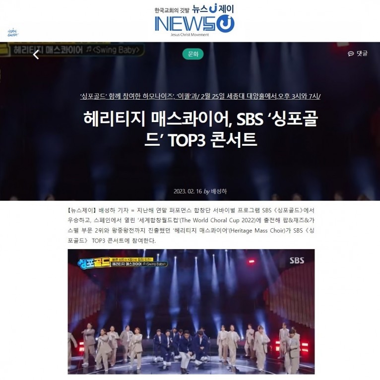 지난해 연말 퍼포먼스 합창단 서바이벌 프로그램 SBS 《싱포골드》에서 우승하고, 스페인에서 열린 ‘세계합창월드컵’(The World Choral Cup 2022)에 출전해 팝&재즈&가스펠 부문 2위와 왕중왕전까지 진출했던 ‘헤리티지 매스콰이어’(Heritage Mass Choir)가 SBS 《싱포골드》 TOP3 콘서트에 참여한다.