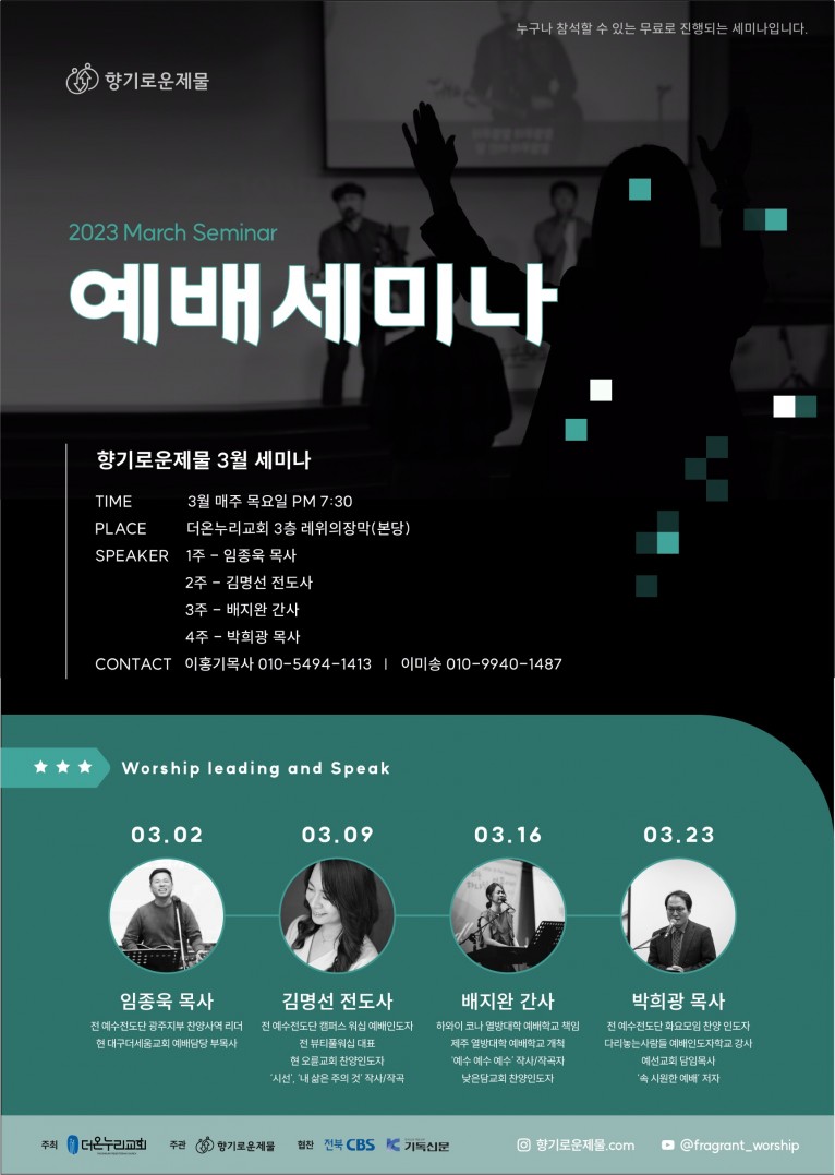 오는 3월 첫 주부터 4주간, 매주 목요일 밤 7시 30분에 전주 더온누리교회 3층 본당에서 무료로 진행되는 이 세미나에는 ‘시선’으로 잘 알려진 찬양 인도자 김명선 등 국내에서 오랫동안 예배인도 사역을 감당하고 있는 영향력 있는 사역자들이 예배인도와 강사로 나서 깊이 있는 예배인도와 놀라운 하나님의 임재를 경험할 수 있는 4주간의 여정이 될 것으로 기대된다.