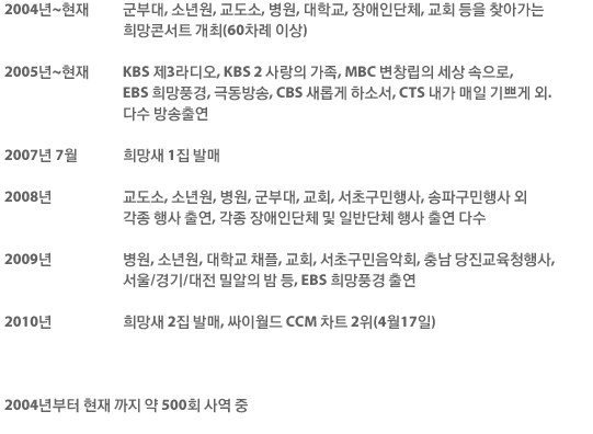 저희 희망새는 모두 지체, 시각장애인들로 구성된 팀입니다. 저희는 장애라는 환경이 매순간 ‘너 같은 전신마비 장애인이, 앞도 못 보는 네가 뭘 할 수 있겠어? 네 주제를 알아야지!’ 라고 저희를 온통 누르며 옥죄려고 합니다. 환경을 보면 주저앉았을 테지만 주님을 바라보기에 희망새는 오늘도 전국을 다니며 아버지의 이름을 찬양합니다.