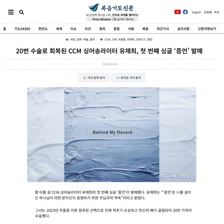 [기사] 20번 수술로 회복된 CCM 싱어송라이터 유채희, 첫 번째 싱글 ‘증언’ 발매(복음기도신문)