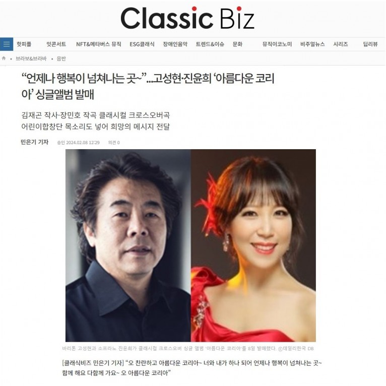 [기사] “언제나 행복이 넘쳐나는 곳~”...고성현·진윤희 ‘아름다운 코리아’ 싱글앨범 발매 (클래식비즈)