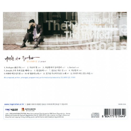 The Poor The Invited 한동대학교 前총학생회장, '워십리더' 이대귀의 총제작진행 - 조준모 보컬의 '가난한자가 들어간다'의 총 12트랙 가난한 시대를 사는 부유한 그리스도인을 향한 초대의 메시지 오스왈드챔버스, 자크엘룰의 사상으로부터 영감을 얻은 복음적 메시지가 음악과 만나다. 독특한 앨범자켓과 '근심하며 돌아간 부자청년'의 이미지를 차용한 사진 이미지가 신선하다. 다시 한번쯤 보게 만드는 '가난한 자가 들어간다'는 문구 또한 인상적이다. 수록된 12곡 중에 눈에 띄는 곡은 단연 찬양 사역자이자 한동대학교 교수인 조준모와 듀엣으로 부른 타이틀 동명의 곡 '가난한자가 들어간다'이다. 들으면 함께 흥얼거리게되는 아름다운 멜로디와, 세련된 악기 편곡에 조준모와 이대귀의 듀엣보컬이 조화롭다. 전곡을 이대귀가 작사, 작곡, 편곡했으며, 기타와 색소폰을 제외하고 모든 연주를 혼자 했고, 앨범 전체가 '하나님 나라'와 '가난한 자'사이의 관계, 이웃과 사회 속에서 크리스천 청년이 고민하고 갈등하는 실제적인 문제에 대한 영적탐구에 집중하고 있으며 깊은 묵상을 통해 빚어진 한 곡 한 곡의 가사에서 깊이를 느낄 수 있다. 이로서 우리는 CCM계에 독보적인 싱어 송 라이터 한명을 얻어낸 셈이다. 전 앨범을 통해서 젊은 청년의 열정과 하나님나라에 대한 목마름과 간절함을 내세우면서 엮어진 리드미컬한 구성도 간간이 맛볼 수 있다. 'Invited'라는 곡은 전체 가사는 비교적 짧은데 뛰어난 음악성과 편곡, 모던한 분위기로 구성하여 앨범의 백미로 자리잡고 있다. 인스퍼레이션은 '영감,영감을 주는 사람'이란 뜻의 영단어이다. 모든 메시지가 매우 고무적이고 듣는 이로 하여금 '가난함에 대한 묵상'을 진지하게 하도록 초대한다는 점에서 이 앨범은 지극히 영감이 가득하다.